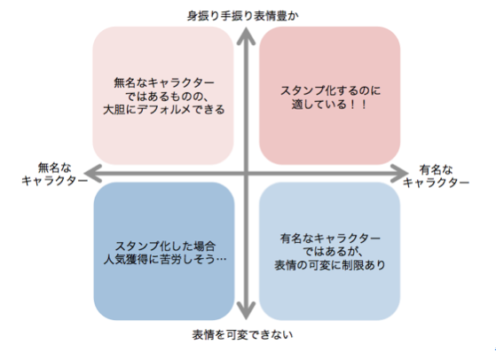 スタンプとしては、表情や身振り手振りをより大きく分かりやすく表現できるキャラクターの方が適しています。認知のとれた有名なキャラクターでも表現に制限があるキャラクターと、無名だけれどもドラスティックな表現が可能なキャラクターであれば、後者の方がスタンプ向きと言えます。上記の表で言えば上段の方がスタンプに向いています。