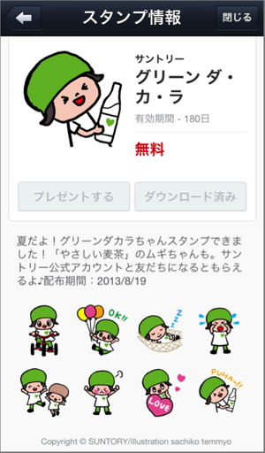 LINEマストバイであれば、言わずもがな「この商品を買えばLINEスタンプが貰えるよ!」ということになるわけですが、LINEスタンプの場合には“その先”があります。プレゼントを“貰って終わり”という従来のベタ付けに対し、LINEスタンプにはユーザがその後のコミュニケーションで利用するという利点があります。スタンプを通じてプレミアムキャンペーンの情報が広がっていくわけですね。