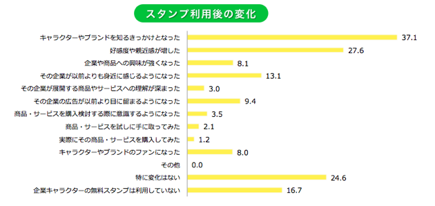 非常に多くのユーザーが使っているスポンサードスタンプですが、キャラクター、企業、ブランドへの認知に一役買っているほか、企業への興味や好感度が増したという結果にもつながっているようです。つまりLINEのスポンサードスタンプを通して、「意識変容」や「態度変容」を起こす効果が確認されています。