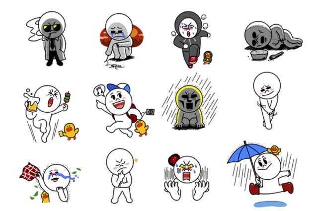 制作時には、スタンプ一つ一つのクリエイティブに目が行きがちですが、送信前にユーザーが目にするのは、他のスポンサードスタンプや有料スタンプと並列して、8種類のサムネイルが表示される一覧画面です。毎週新たなスタンプがリリースされていく中で、他のキャラクターとの熾烈な競争を勝ち抜くためには、感情はもちろん、顔のアップや全身を使ったポーズ、象徴的なアイテムや、感情に合わせた背景画像、そして寒暖やカラフルな色使いなど、表現内容が重複することなくバリエーションを豊かにして、一つ一つのスタンプの視認性を高めることが必要となります。3. 単純明快かつ大胆に