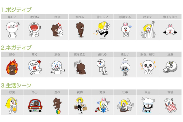スポンサードスタンプは8種もしくは16種でリリースされますが、大別するとポジティブ/ネガティブな喜怒哀楽の感情系、「いいね!」や「NO」などの回答系、風呂や買物などの生活シーン系、「おはよう」や「いってらっしゃい」などの挨拶系、そして「暑い」や「メリークリスマス」などの季節系に分類することができます。代表的なバリエーション8種をLINEキャラクターで例えると以下のようになります。