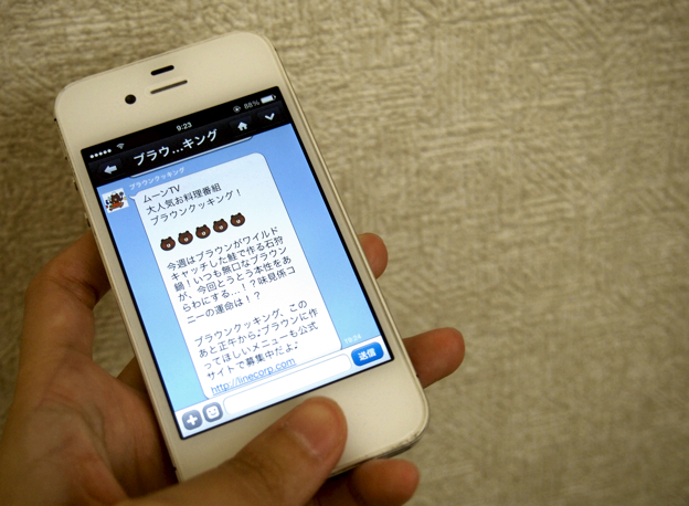 上記はLINEのキャラクター「ムーン」です。上のようにキャラクターがユーザーの気持ちや気分、状況を代弁してくれるというわけです。スタンプは、3種類のバリエーションがあります。1つは、LINEをインストールした時点から無料で使えるブラウン、コニーなどLINEキャラクターのスタンプ。2つ目は、170円ほどで有料販売されているミッキーマウスやドラえもんなどのキャラクターのスタンプ。3つ目は、昨年の7月頃からはじまった、企業のキャラクターなどをスタンプ化したスポンサードスタンプです。